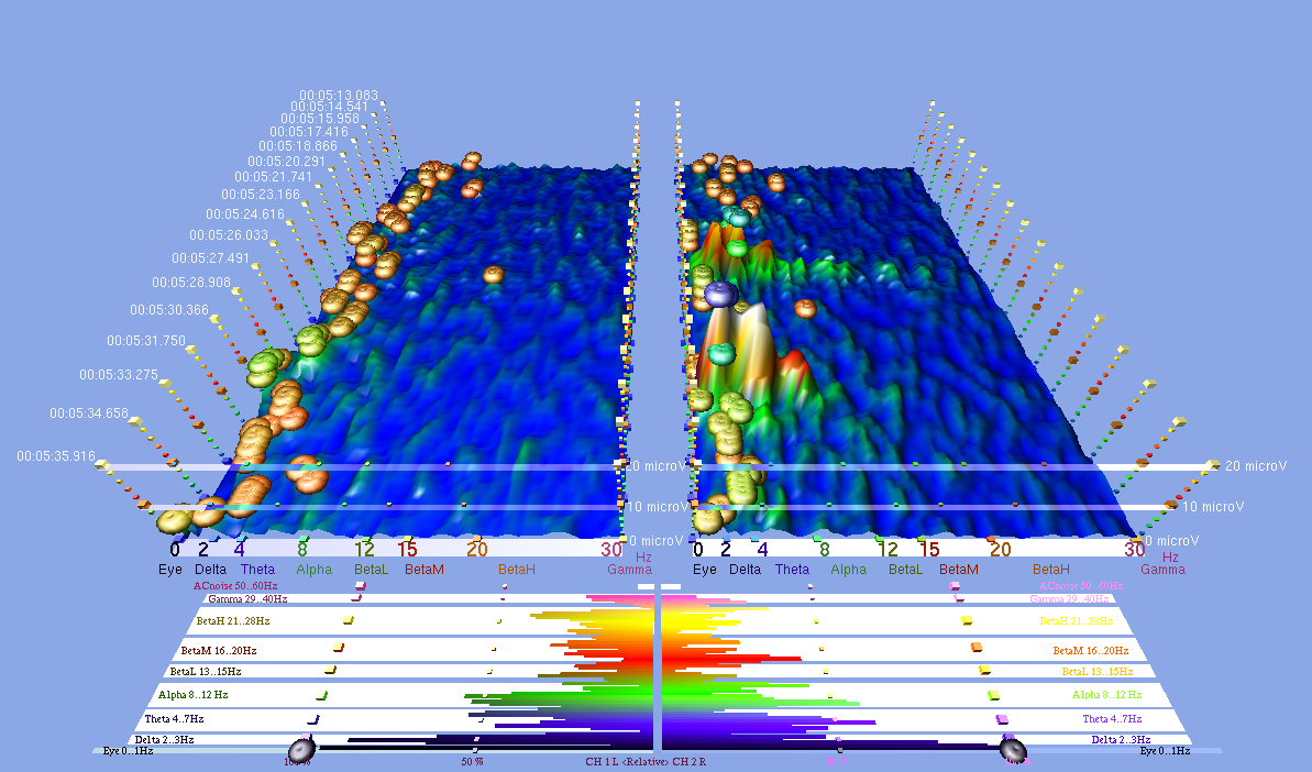 Los diagramas a continuación son una representación 3D de patrones de ondas cerebrales registrados usando un registrador IBVA. A través del ancho del diagrama está la frecuencia desde delta en la izquierda, a gama en la derecha. El tiempo se registra en la longitud de la tira – cada diagrama es de un segmento de tiempo de cinco minutos. La amplitud se muestra en la altura en microvoltios.